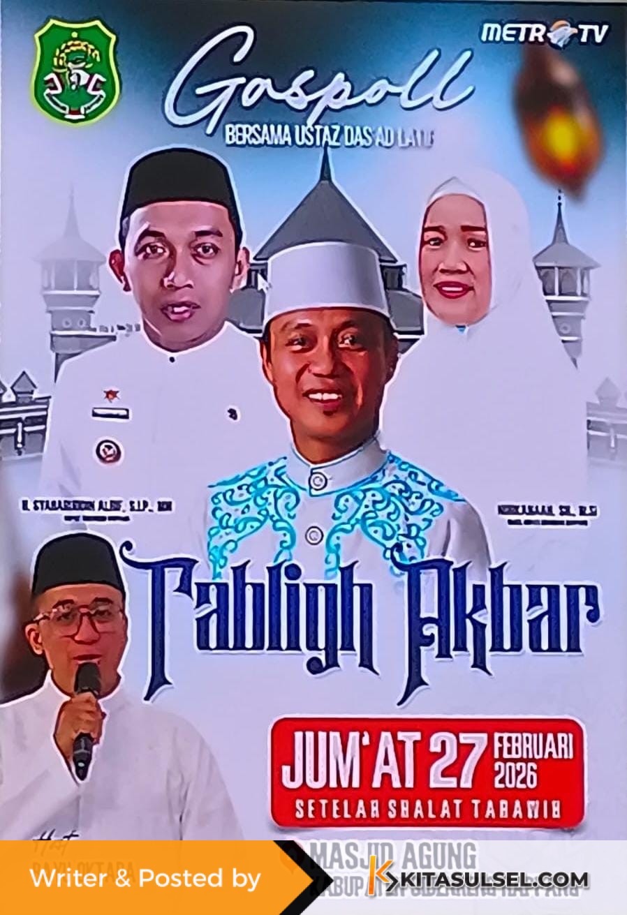 Tabligh Akbar tersebut dijadwalkan berlangsung pada Jumat malam, 27 Februari 2026, di pelataran Masjid Agung Sidrap, usai pelaksanaan shalat Tarawih. Acara akan menghadirkan dai kondang nasional, Das’ad Latif yang dikenal luas dengan gaya dakwah yang komunikatif dan inspiratif.