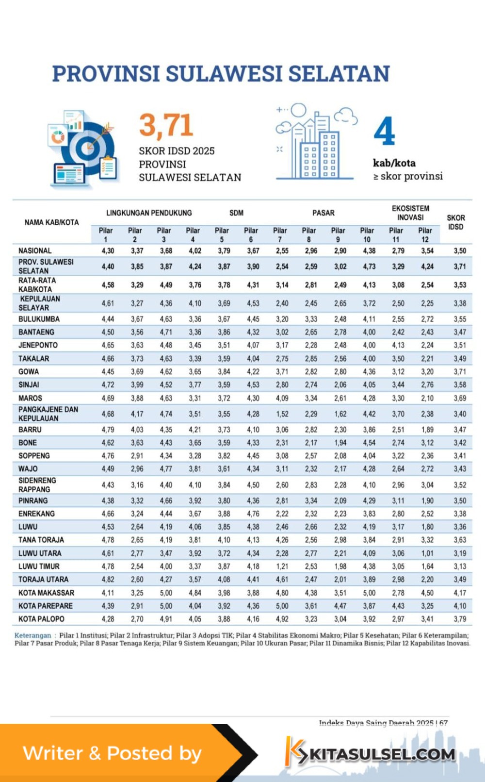 Kitasulsel–Makassar ā Indeks Daya Saing Daerah (IDSD) Sulawesi Selatan tahun 2025 menunjukkan tren peningkatan positif. Berdasarkan data terbaru yang dirilis Badan Riset dan Inovasi Nasional (BRIN), skor daya saing provinsi tercatat 3,71, naik dari 3,61 pada 2024 atau meningkat 0,10 poin.