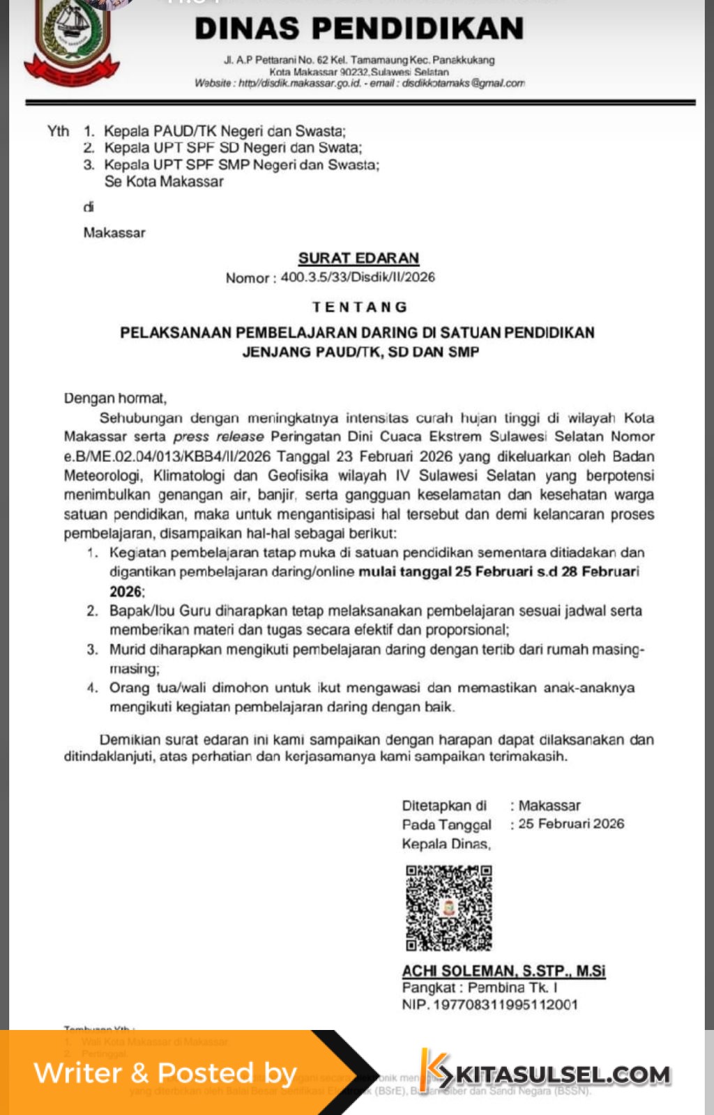 Surat Edaran bernomor 400.3.5/33/Disdik/II/2026 tersebut ditandatangani Kepala Disdik Makassar, Achi Soleman, dan diterbitkan pada Rabu (25/2/2026).