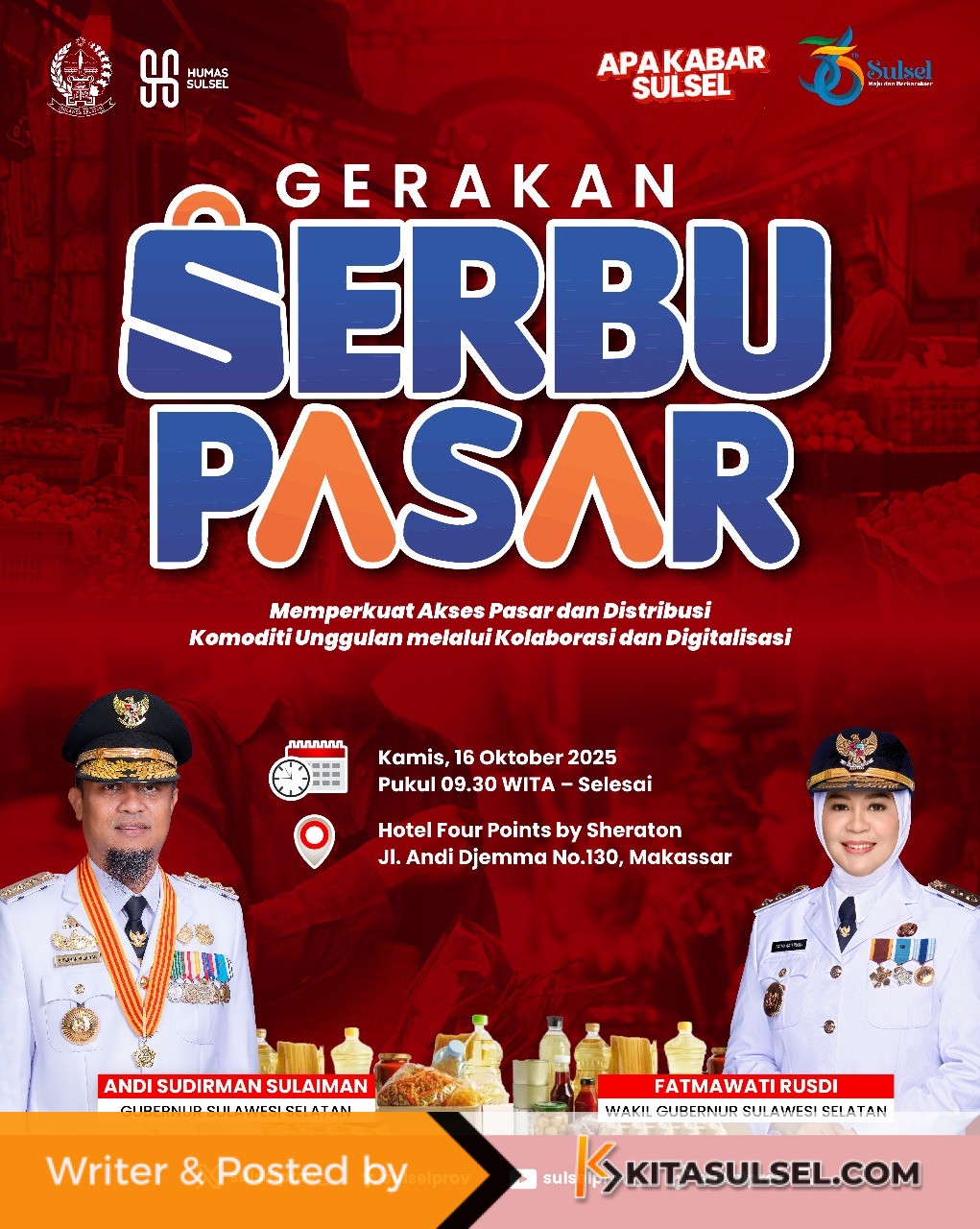 Kitasulsel–MAKASSAR Pemerintah Provinsi Sulawesi Selatan melalui Dinas Perindustrian dan Perdagangan (Disperindag) Provinsi Sulsel akan meluncurkan Gerakan Serbu Pasar (Serapan Komoditi Unggulan untuk Perluasan dan Percepatan Pasar) yang dirangkaikan dengan kegiatan Business Matching pada hari Kamis (16/10/2025) di Hotel Four Points by Sheraton Makassar. Rencananya, akan dibuka secara resmi oleh Menteri Perdagangan RI.