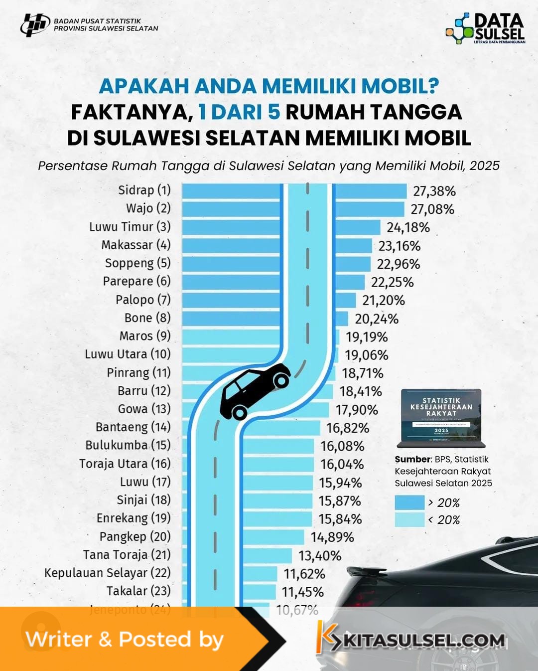 Posisi kedua ditempati Kabupaten Wajo dengan persentase 27,08 persen, disusul Luwu Timur sebesar 24,18 persen. Sementara itu, Kota Makassar sebagai pusat ekonomi dan kota metropolitan di Sulsel berada di peringkat keempat dengan tingkat kepemilikan mobil sebesar 23,16 persen.
