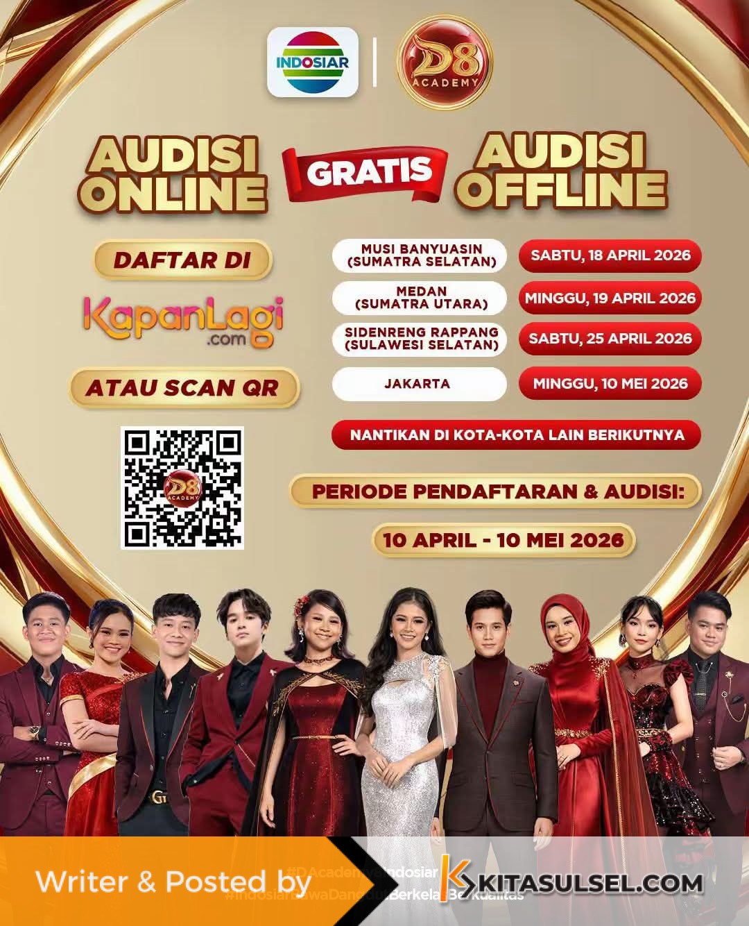 Berdasarkan informasi resmi yang diterima, audisi DA8 dibuka secara online dan offline dengan periode pendaftaran dan audisi mulai 10 April hingga 10 Mei 2026, serta pendaftaran dilakukan secara gratis melalui laman resmi kapanlagi.com atau dengan memindai barcode yang disediakan oleh pihak Indosiar.
