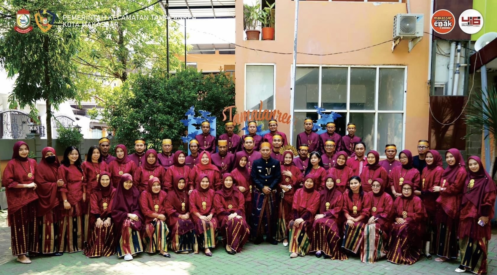 Kitasulsel—Makassar—Jajaran Sekretariat Pemerintah Kecamatan Tamalanrea memperingati HUT ke-416 tahun Kota Makassar dengan menggunakan Baju Adat Bugis Makassar saat menjalankan tugas di Kantor Kecamatan Tamalanrea, Kamis (09/11/2023).