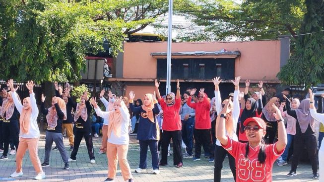 Kitasulsel–Makassar–Ketua DWP Unita Kecamatan Panakkukang dr. Andi Tenri Pangerang bersama Wakilnya Tita Irsani Muis menggelar kegiatan senam bersama di Halaman Kantor Camat Panakkukang,Jumat 1 /12/2023.