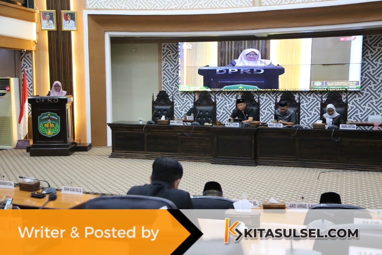 Kitasulsel–LUWUTIMUR Wakil Bupati Luwu Timur, Hj. Puspawati Husler, menyampaikan Jawaban Bupati atas Pandangan Umum Fraksi-fraksi DPRD terhadap tiga Rancangan Peraturan Daerah (Ranperda) dalam Rapat Paripurna DPRD Luwu Timur, Kamis (19/2/2026).