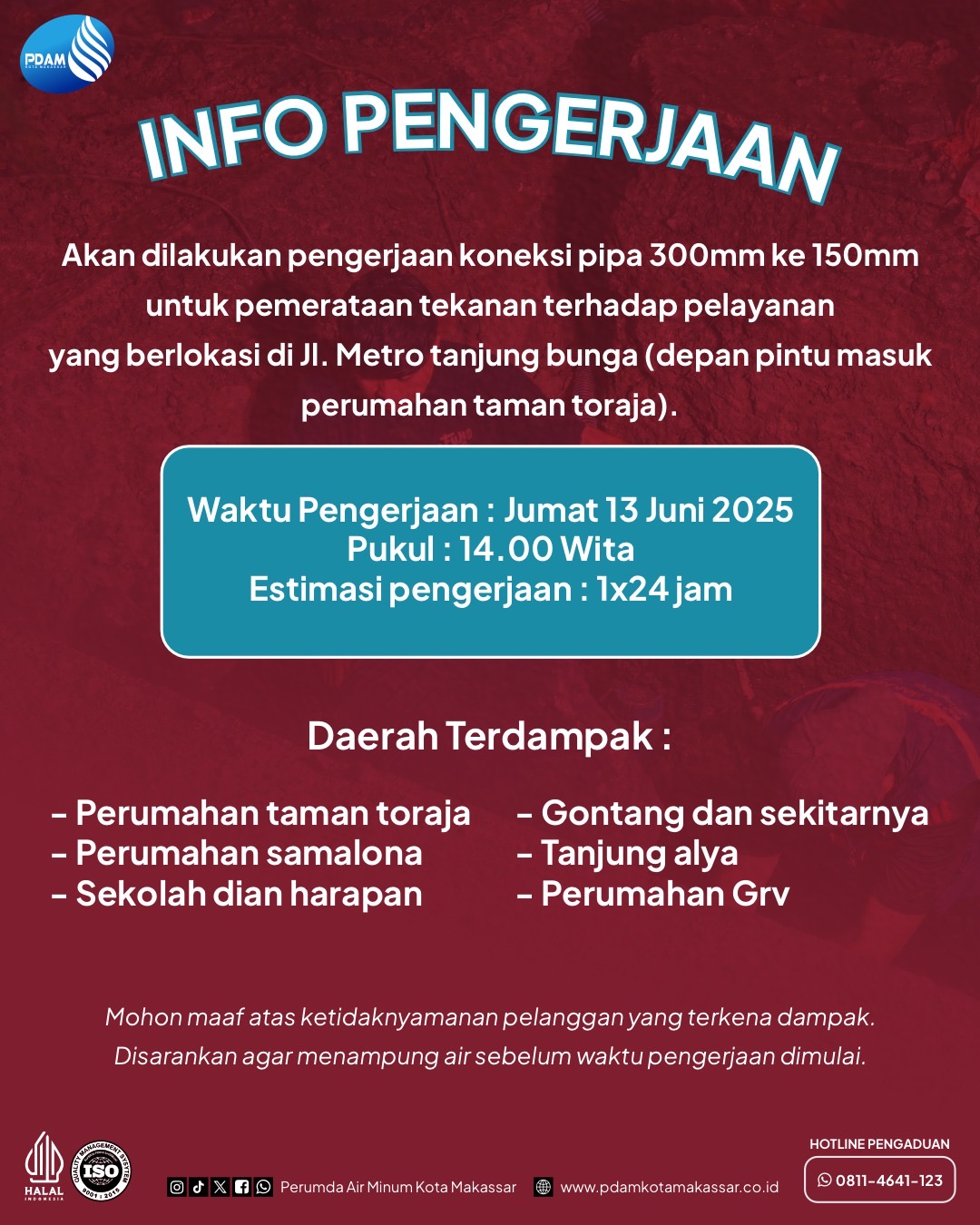 Plt Kepala Bagian Distribusi dan Kehilangan Air (DKA) PDAM Kota Makassar, Rommy Arief Derianto mengimbau kepada warga di wilayah terdampak untuk melakukan penampungan air secukupnya sebelum pekerjaan dimulai, guna mengantisipasi kebutuhan air selama proses berlangsung.