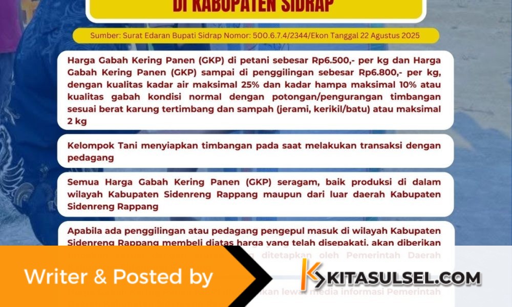 Kitasulsel–SIDRAP Pemerintah Kabupaten Sidenreng Rappang (Sidrap) Provinsi Sulawesi Selatan telah mengeluarkan surat edaran terkait kesepakatan harga gabah untuk wilayahnya. Surat edaran dengan Nomor 500.6.7.4/2344/Ekon ini ditandatangani...
